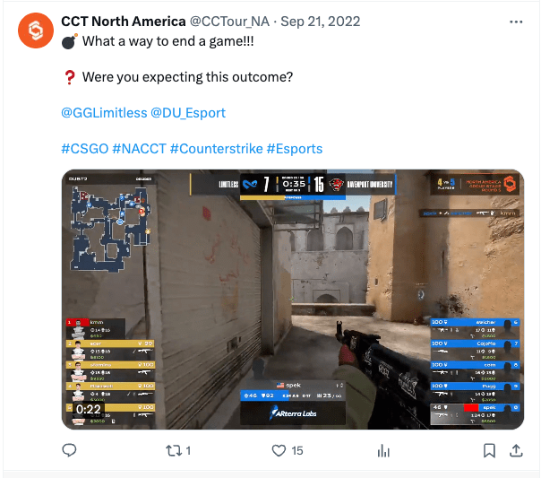 Tweets highlighted some of CCT’s best moments and plays. In both capacities, we established a collaborative workflow with clients (CCT North America production teams) and ensured seamless communication and coordination for CCT North America tournaments. This required working with team members from different nations such as Mexico, Spain, the United States, and Ukraine. Managing a diverse team – including graphic designers, game moderators, community managers, and esports production staff – was key to the success of these projects.