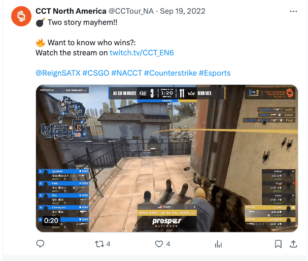 Our team spearheaded the launch of the tournament’s Twitter account, managing all content for the initial games. We produced over 80 tweets to promote the Counter-Strike North America tournament, focusing on creating engaging and informative content that resonated with the target audience.